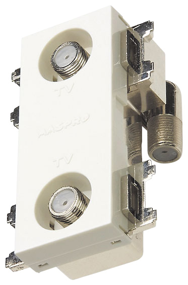 壁面に設置するテレビ端子数が2つの直列ユニット(コンセントプレート3個用)。スイッチボックス側にくる端子が可動するため、施工性に優れています。配線システムの端末用に使います。
