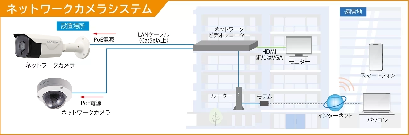 - LANケーブル1本で映像と電源を供給(PoE方式)