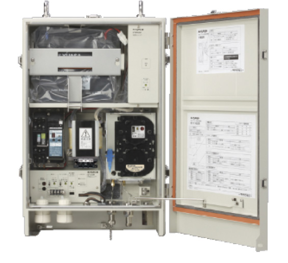 ギャップフィラーシステムで使用する光入力タイプの地上デジタル放送用送信機。バッテリー、ブレーカーや耐雷トランスなどを内蔵したオールインワンパッケージです。定格出力は10mW/ch.です。