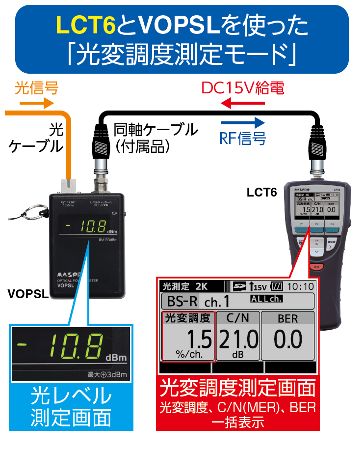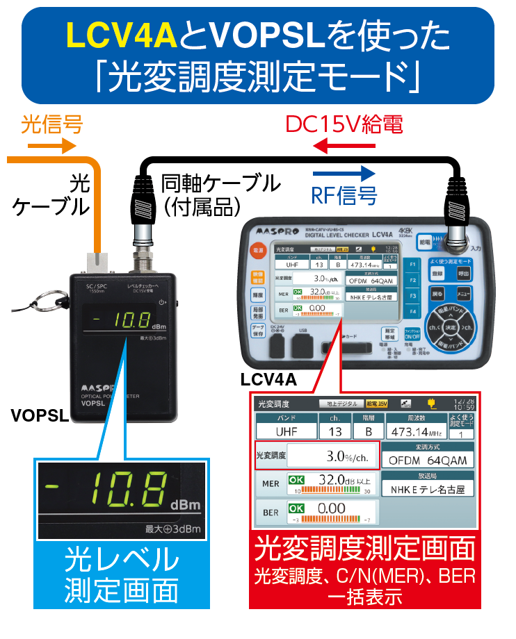 RF出力機能を搭載しており、当社デジタルレベルチェッカーLCV4A、LCT6、LCT5と組合わせることで、業界で初めて光変調度の測定が可能になりました。これにより、光受信機(V-ONU)を設置する際に必要な光パワー(光入力レベル)、RF出力レベル、光変調度の測定ができます。