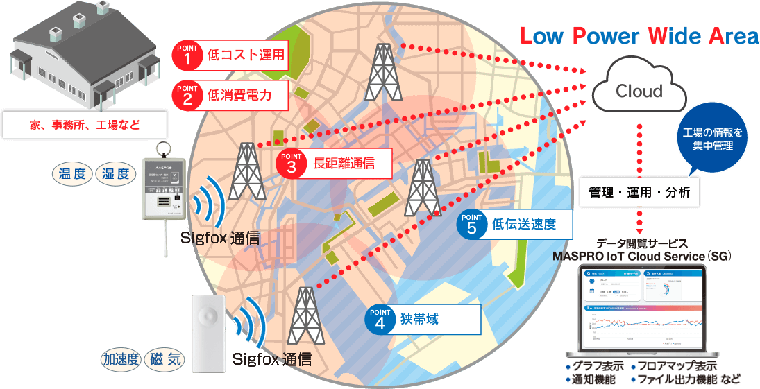 センサー端末で測定したデータを集約、蓄積、一元管理できる、Sigfox通信用端末対応クラウドサービスです。